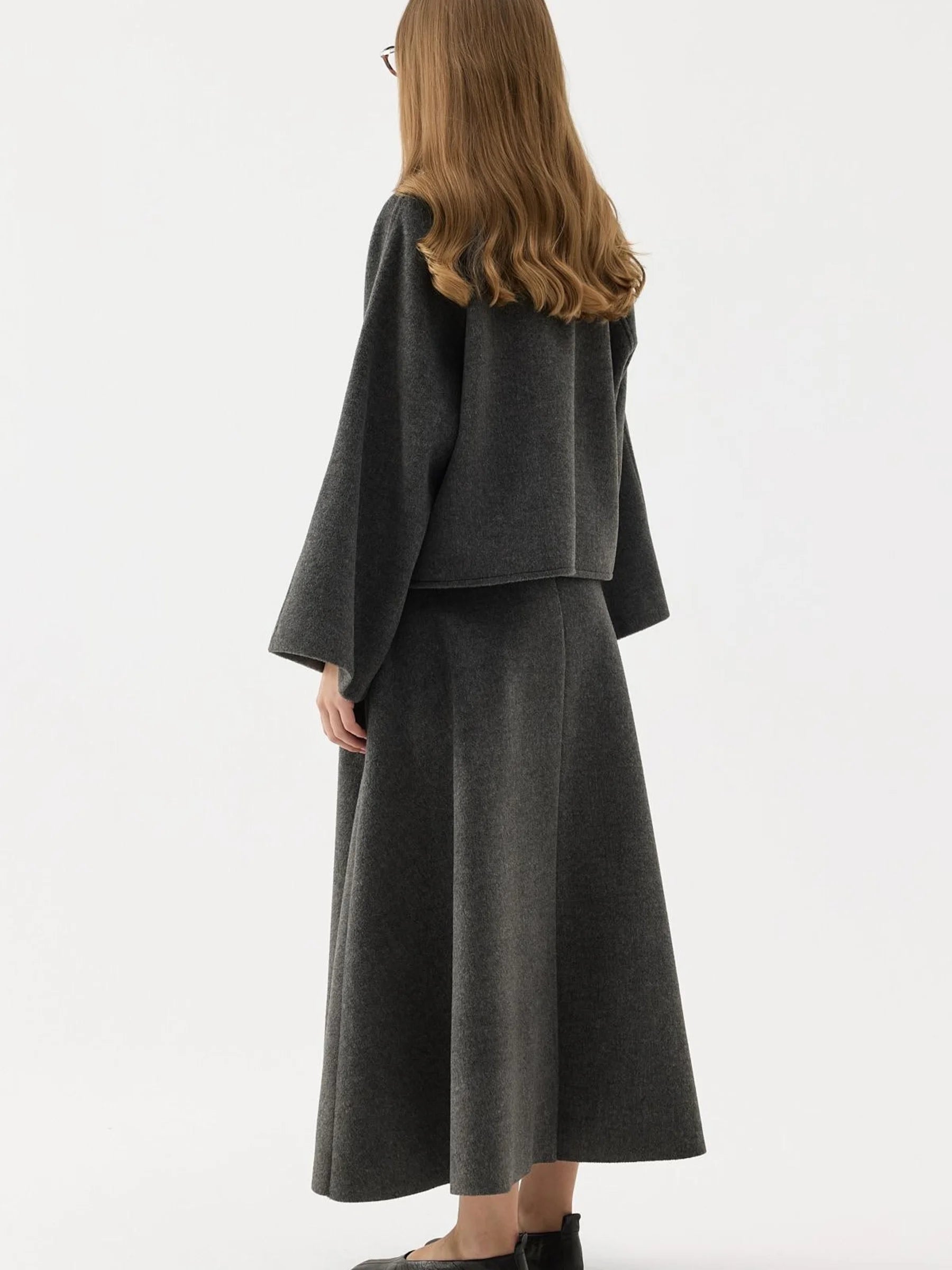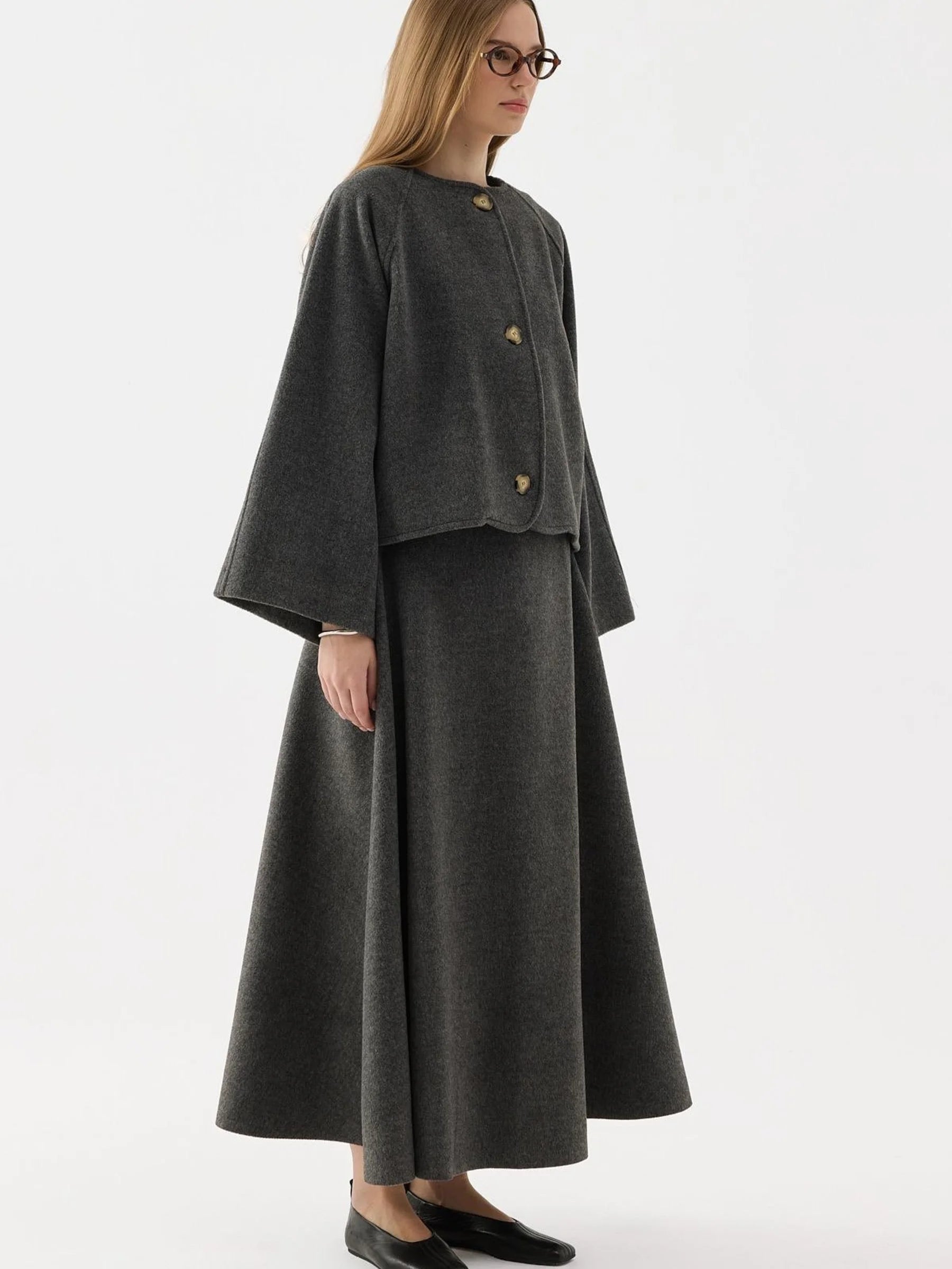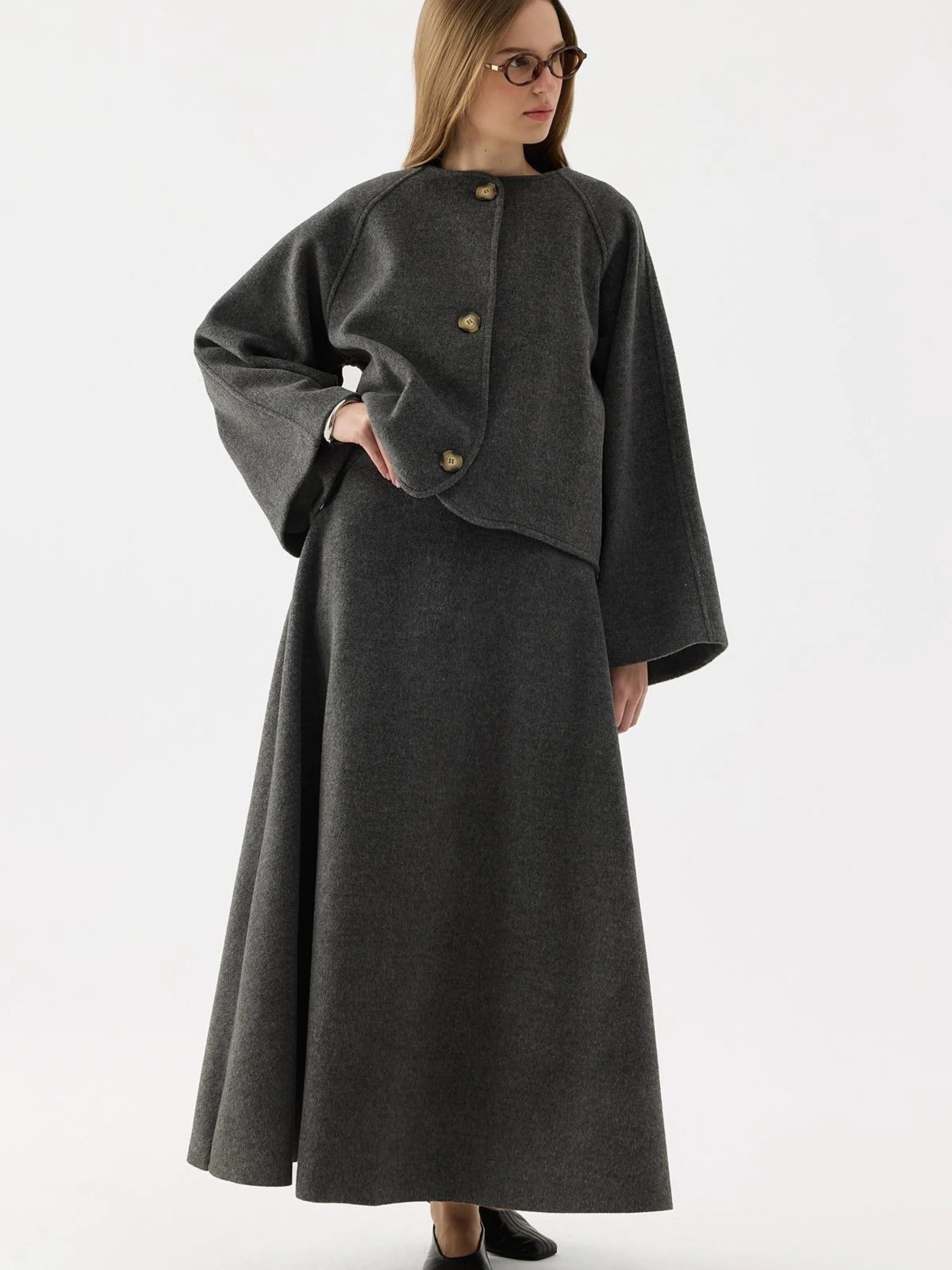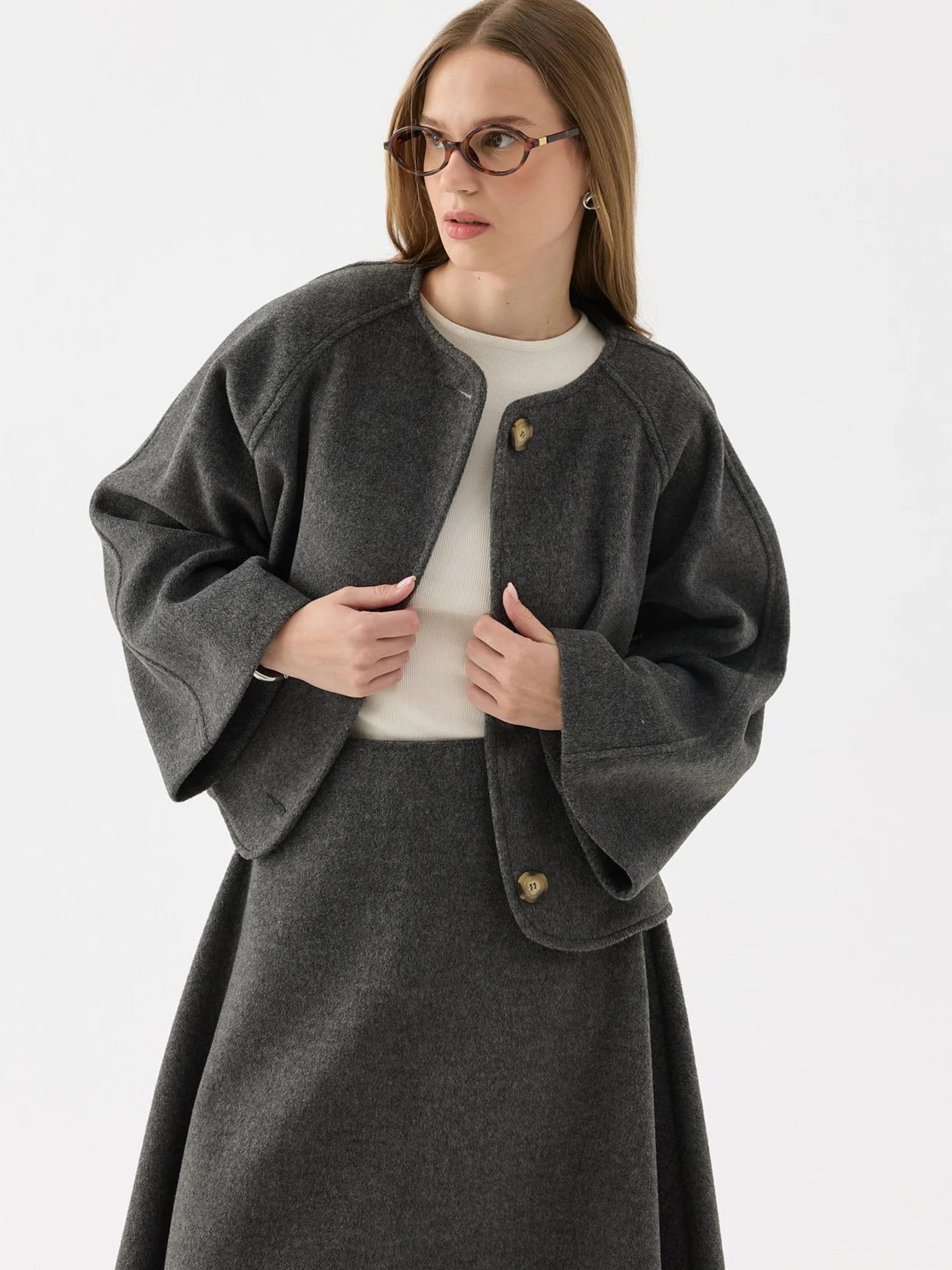 - Zweiteiliges Set mit geknöpfter, offener Jacke und passendem Rock